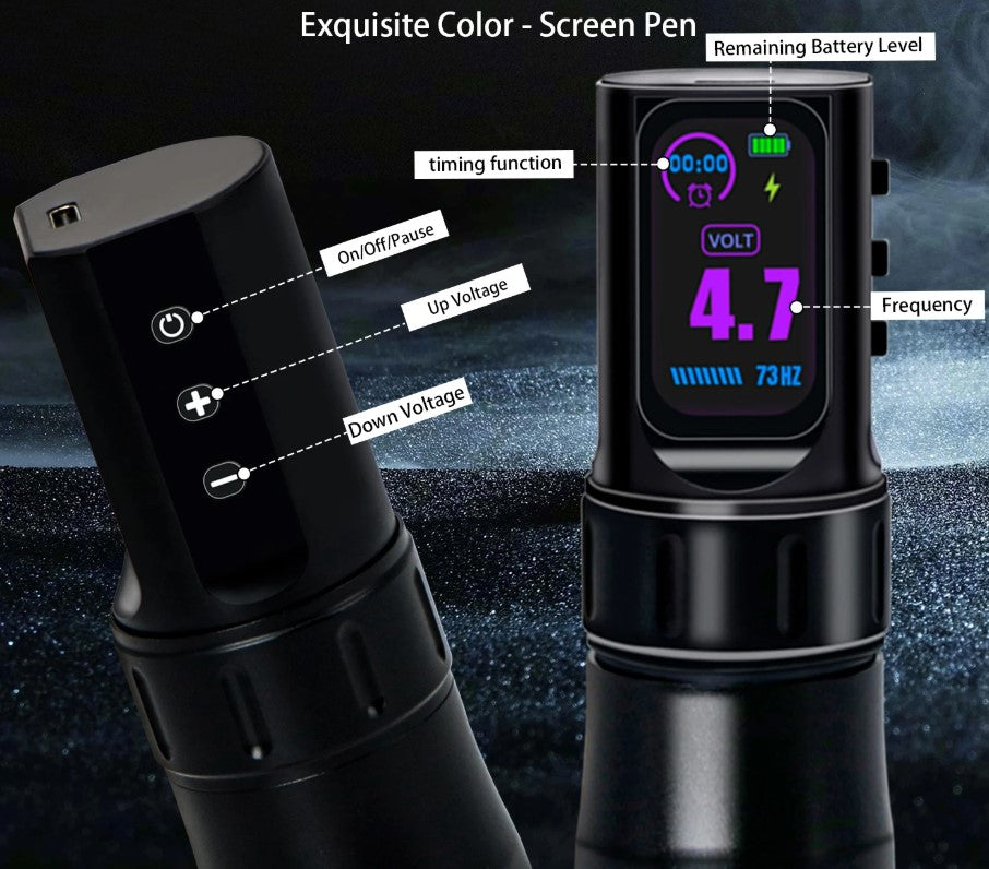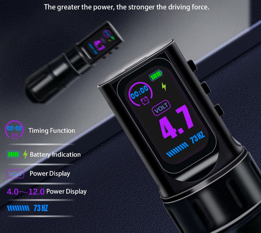 With a power range from 4V to 12V and a visible frequency display (Hz), this pen adapts to every tattooing style